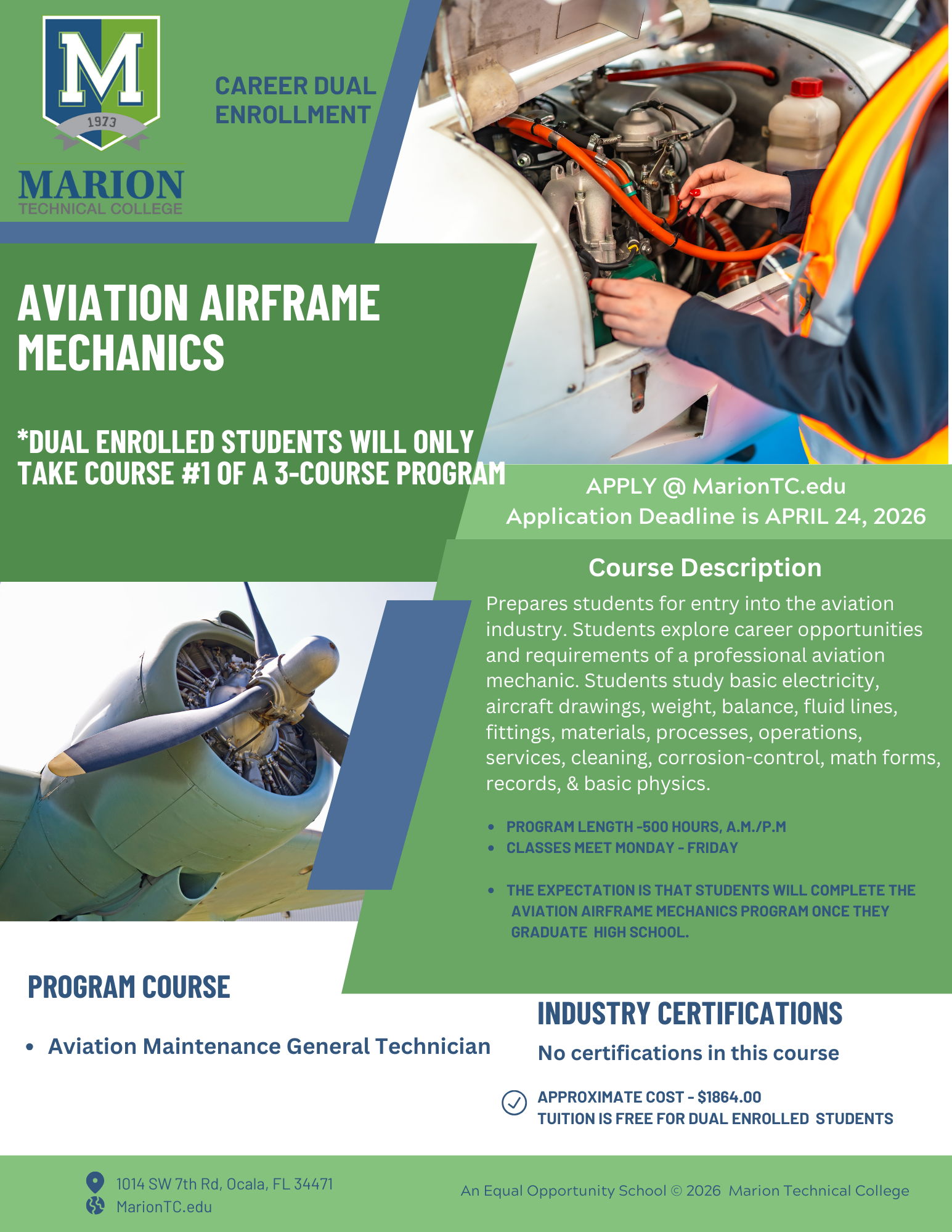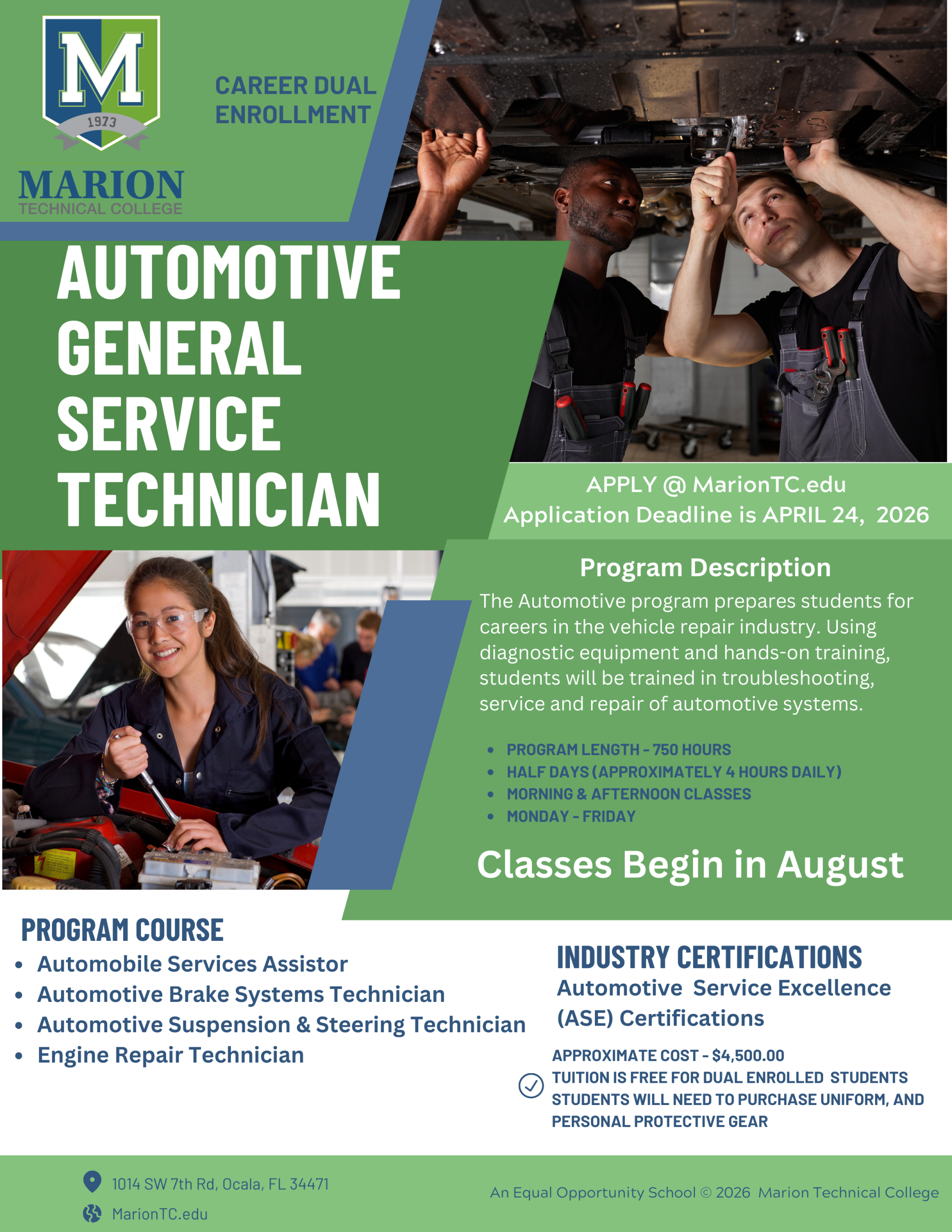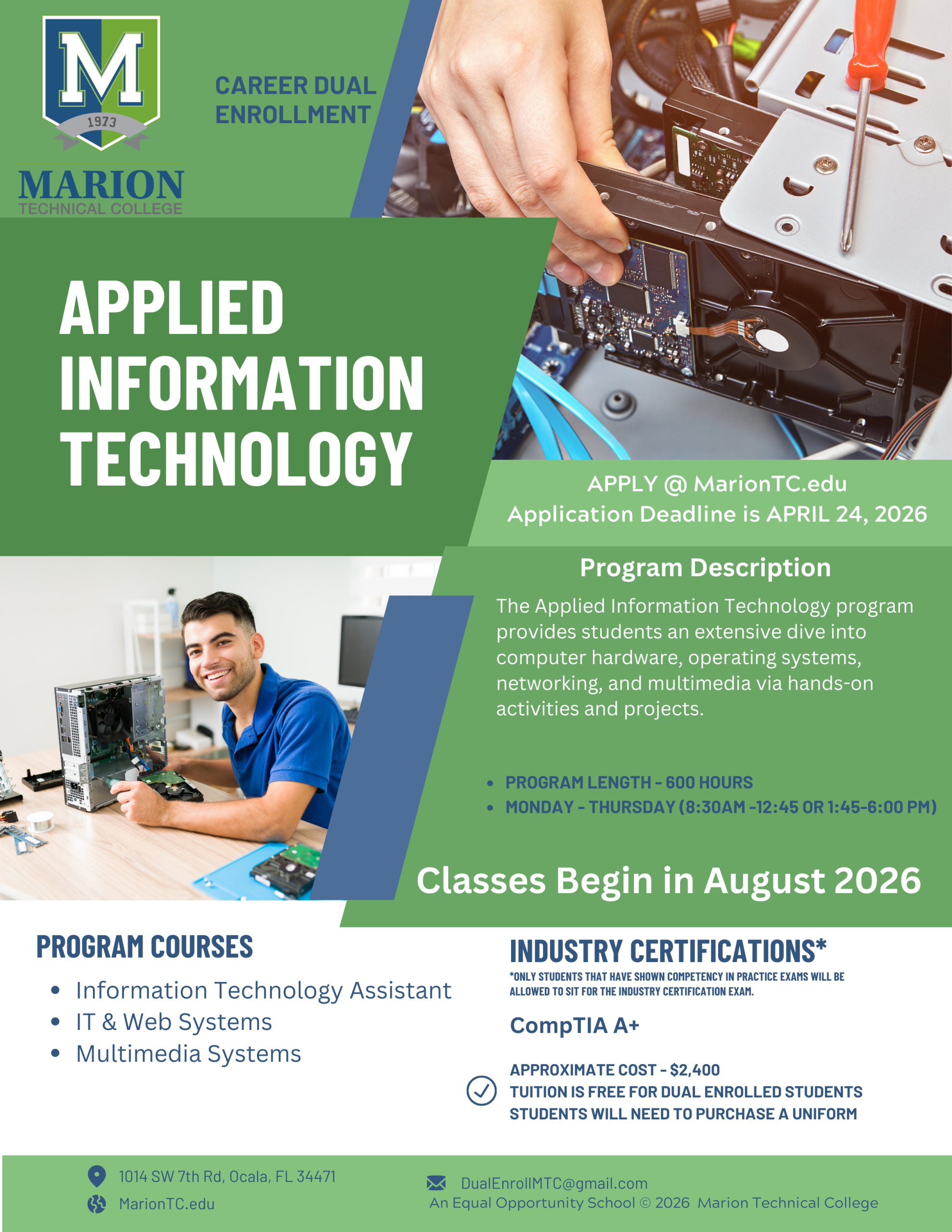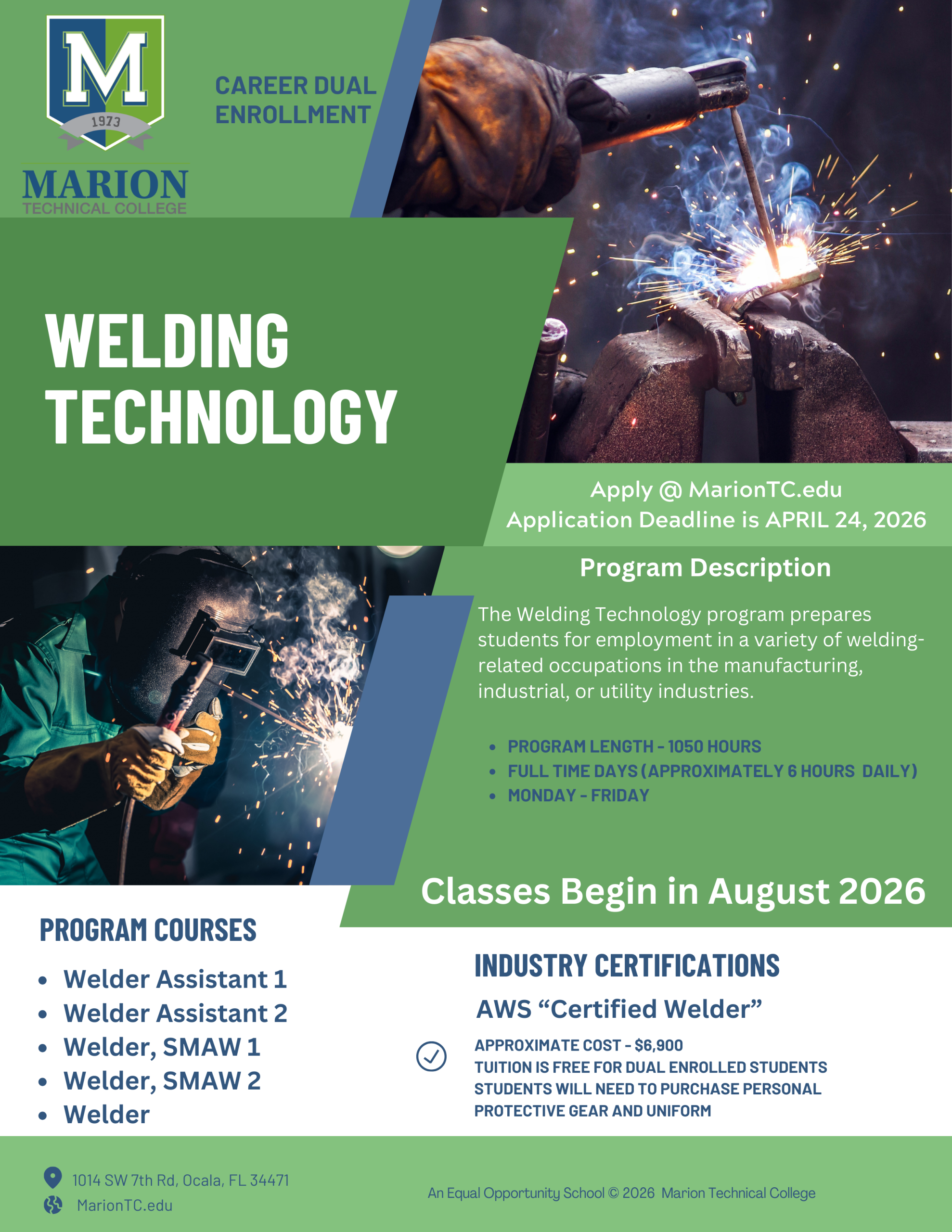 Marion Technical College offers 14 Career Dual Enrollment programs for Marion County full-time high school students, age 16 & older.